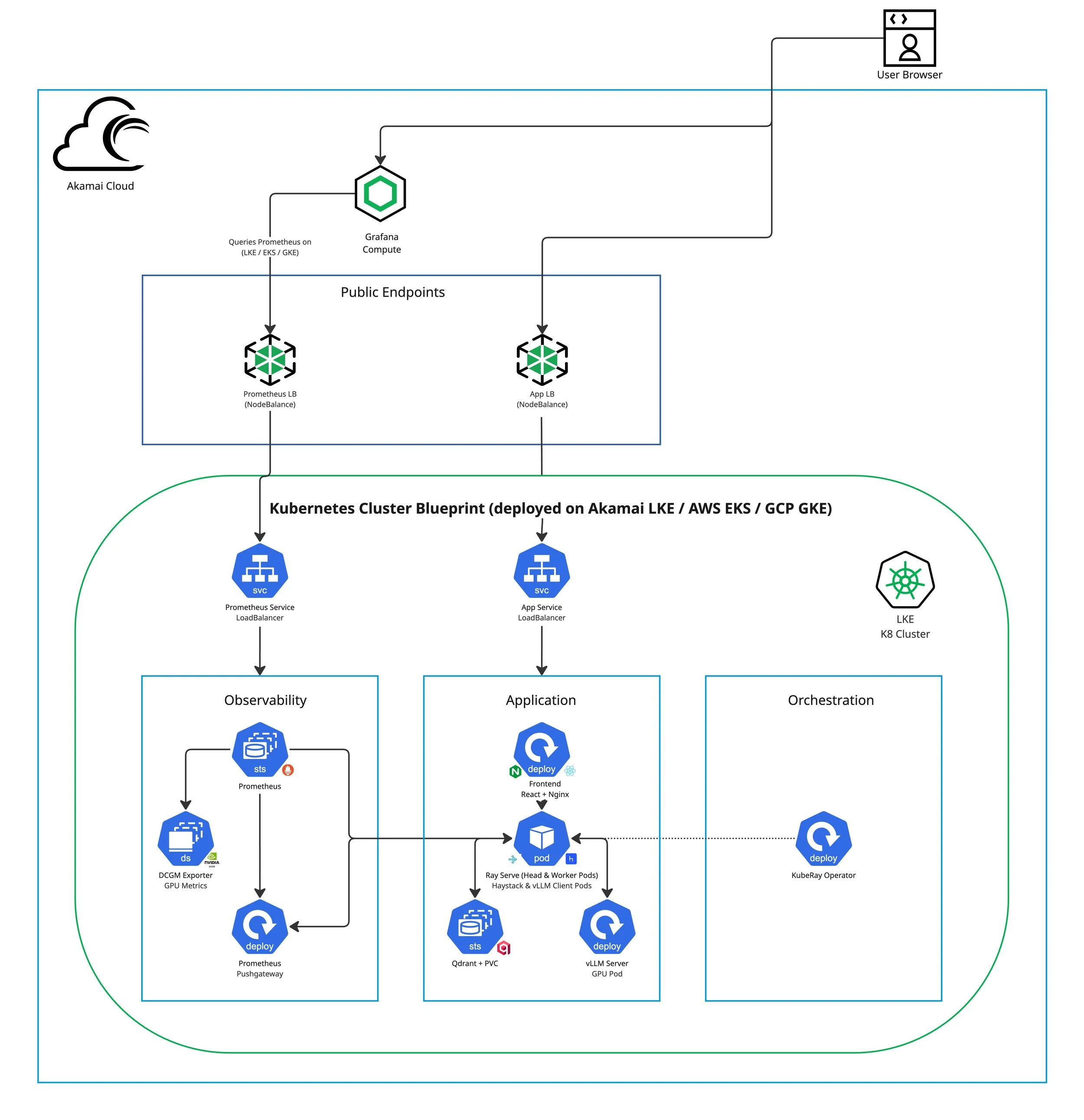 meta,token,done,errorevents back to the UI.Ray runtime (KubeRay-managed cluster): Ray Serve runs on a Ray cluster (head + worker pods) managed by the KubeRay Operator, keeping scaling behavior and deployment shape consistent across providers.
