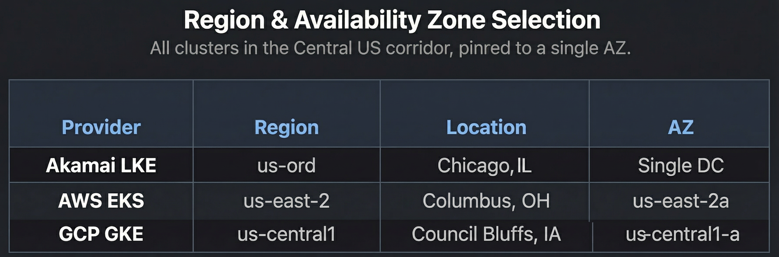 All three clusters are deployed in the Central US corridor to minimize geographic variance in North-South benchmarks. Each cluster is pinned to a single availability zone to eliminate inter-AZ latency noise.