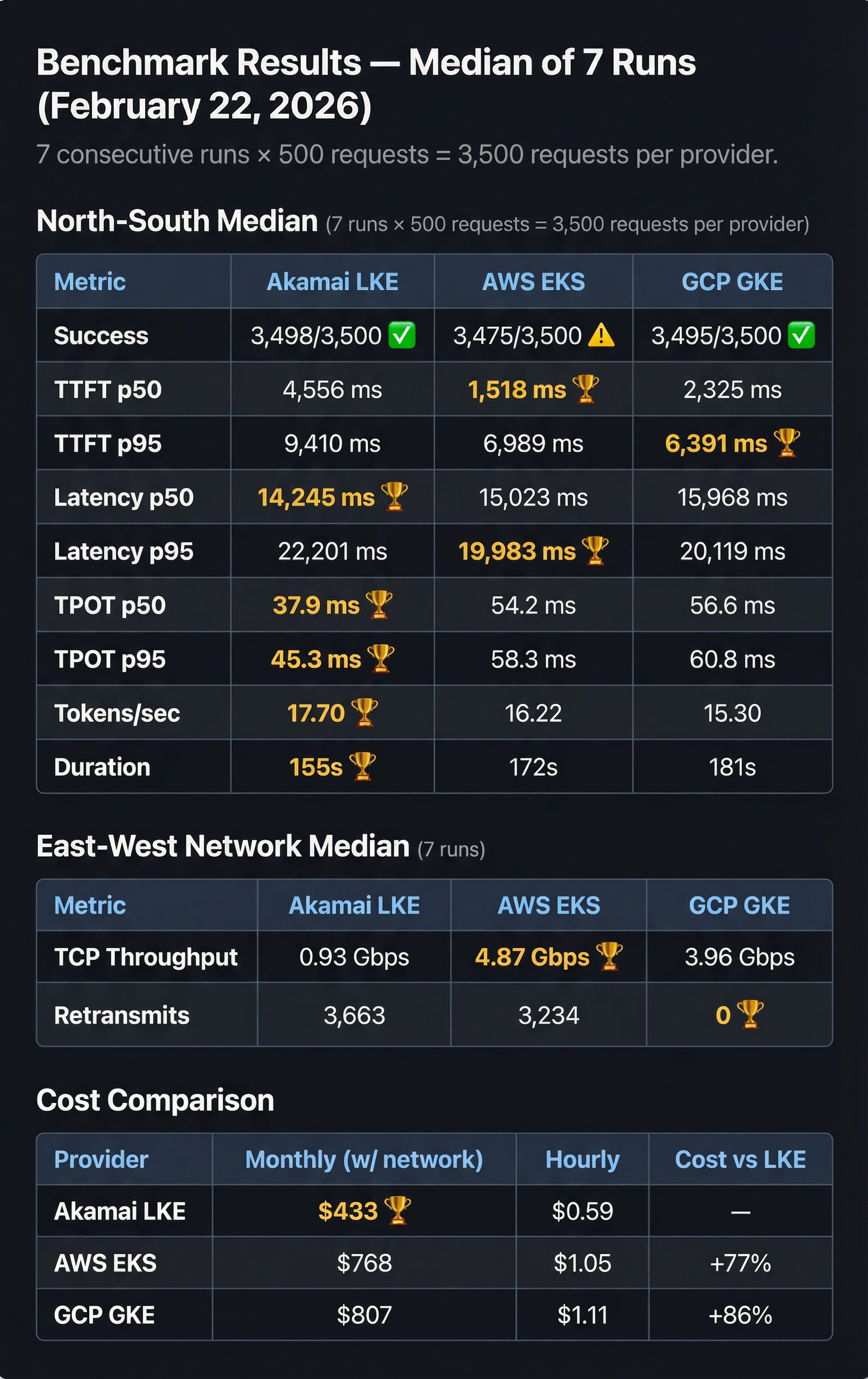 All benchmark runs were executed from a single client in Dallas, TX against single-zone clusters in Chicago (LKE), Ohio / us-east-2 (EKS), and Iowa / us-central1 (GKE). That geography is part of the signal β TTFT and total latency include the full network round-trip from client to cluster, which is exactly what a real user hitting an API endpoint would experience.
