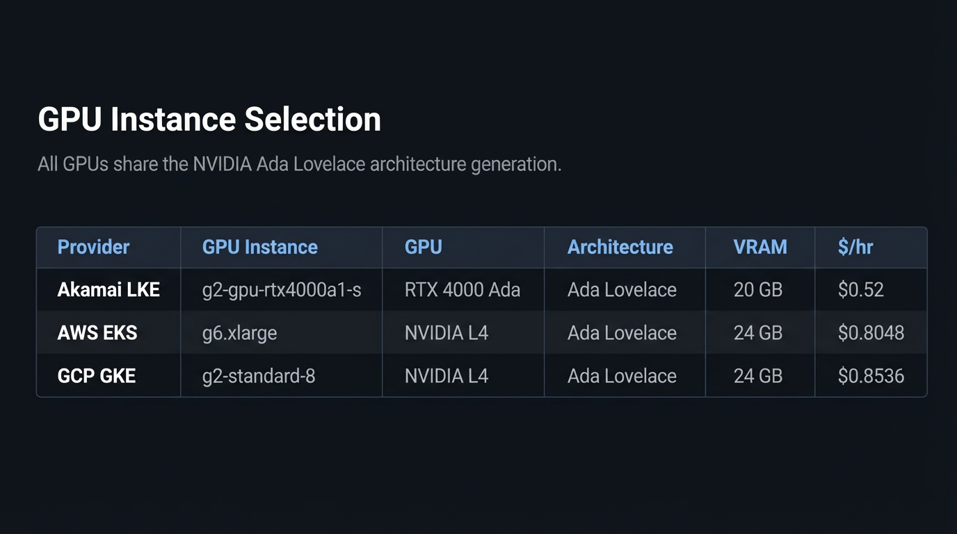AWS and GCP both use the NVIDIA L4βwidely available and commonly used for cost-efficient inference. On Akamai, the closest matching single-GPU option is RTX 4000 Ada. They're not the same SKU, but they share the same Ada Lovelace architecture and target the same job: token-streaming inference at reasonable cost.